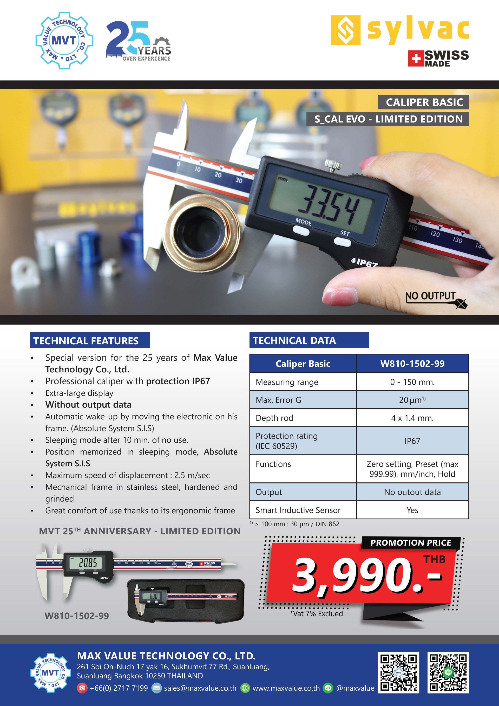 Max Value Technology is pleased to present its Caliper - Limited edition, the S_Cal EVO Basic, which 25th Anniversary. Available now with a measuring range from 0 to 150 mm, No output data, protection rating IP67 and all functions (Zero setting, Preset (max 999.99), mm/inch, Hold)
