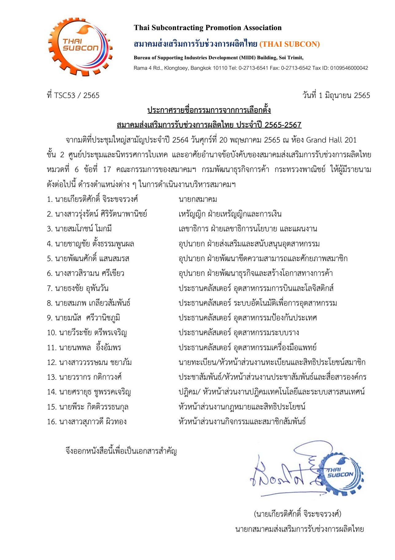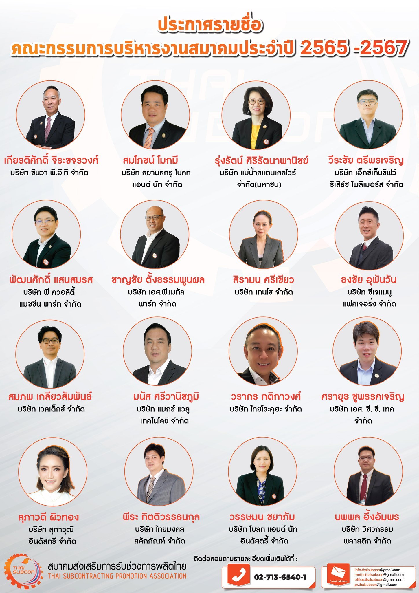 และขอแสดงความยินดีกับคุณมนัส ศรีวานิชภูมิ และคณะกรรมการทุกท่านที่ได้รับเลือกให้ดำรงตำแหน่งบริหารงานภายในสมาคมฯ และขอขอบพระคุณทุกท่านในความเสียสละ และความมุ่งมั่นตั้งใจบริหารงานสมาคมให้เกิดประโยชน์แก่หมู่มวลสมาชิก THAI SUBCON