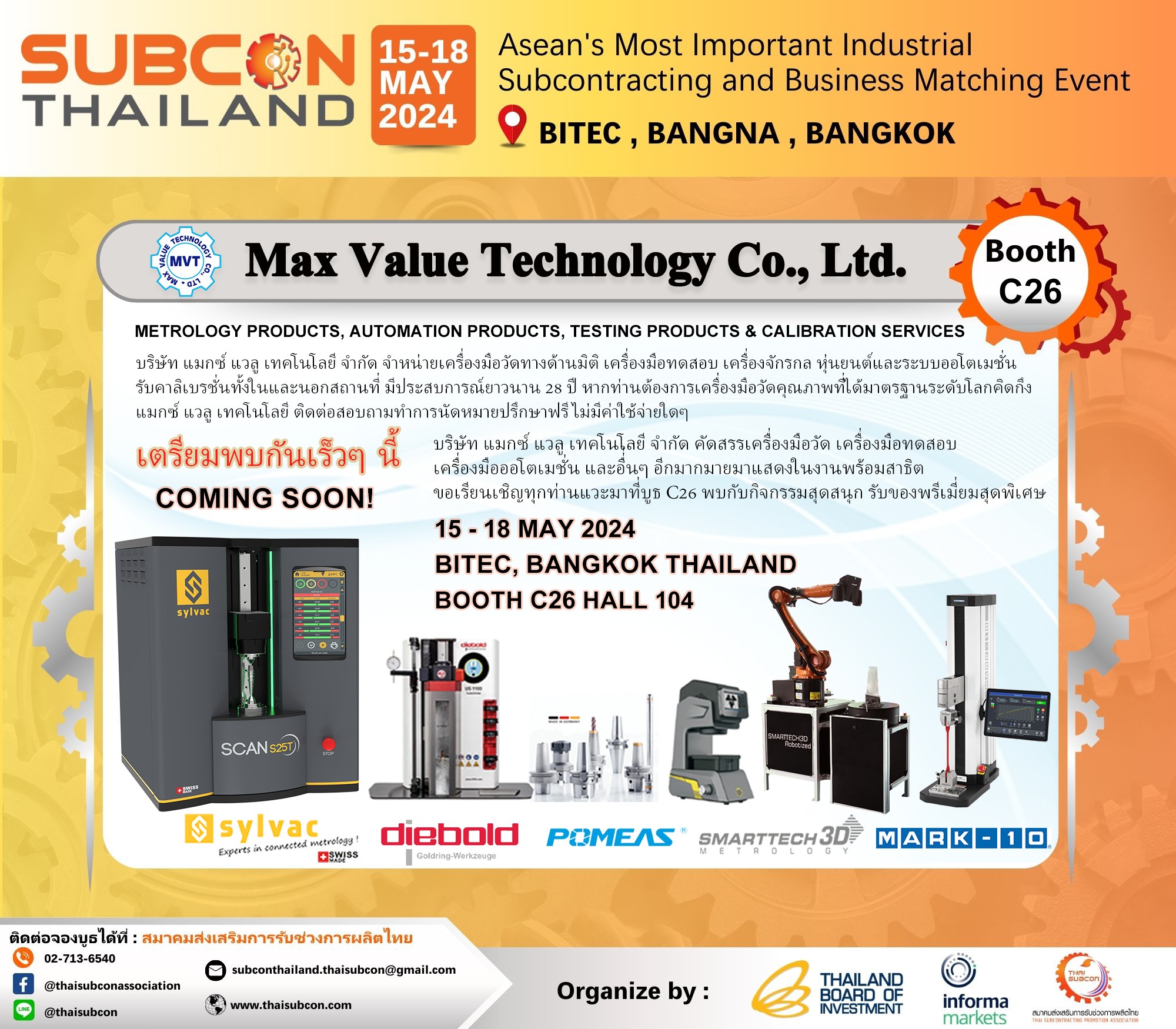 บริษัท แมกซ์ แวลู เทคโนโลยี จำกัด ขอเชิญชวนท่านเข้าร่วมงานแสดงสินค้า SUBCON THAILAND 2024 งานจับคู่ธุรกิจ ผู้ผลิตชิ้นส่วนอุตสาหกรรมเริ่ม 15 - 18 พ.ค. 67 ณ ไบเทค บางนา ฮอล์ 104 พบกับไฮไลต์สินค้าและเทคโนโลยีจากบริษัทฯ ในกลุ่มออโตเมชั่น เครื่องวัดชิ้นส่วนอุตสาหกรรม เครื่องมือทดสอบ เคื่องมือสอบเทียบมาตรฐานระดับสากล ที่บริษัทฯ นำมาจัดแสดงในงาน ขอเรียนเชิญทุกท่านมาเยี่ยมชมบูธและพบกับเราได้ที่ Booth NO. C26 Hall 104