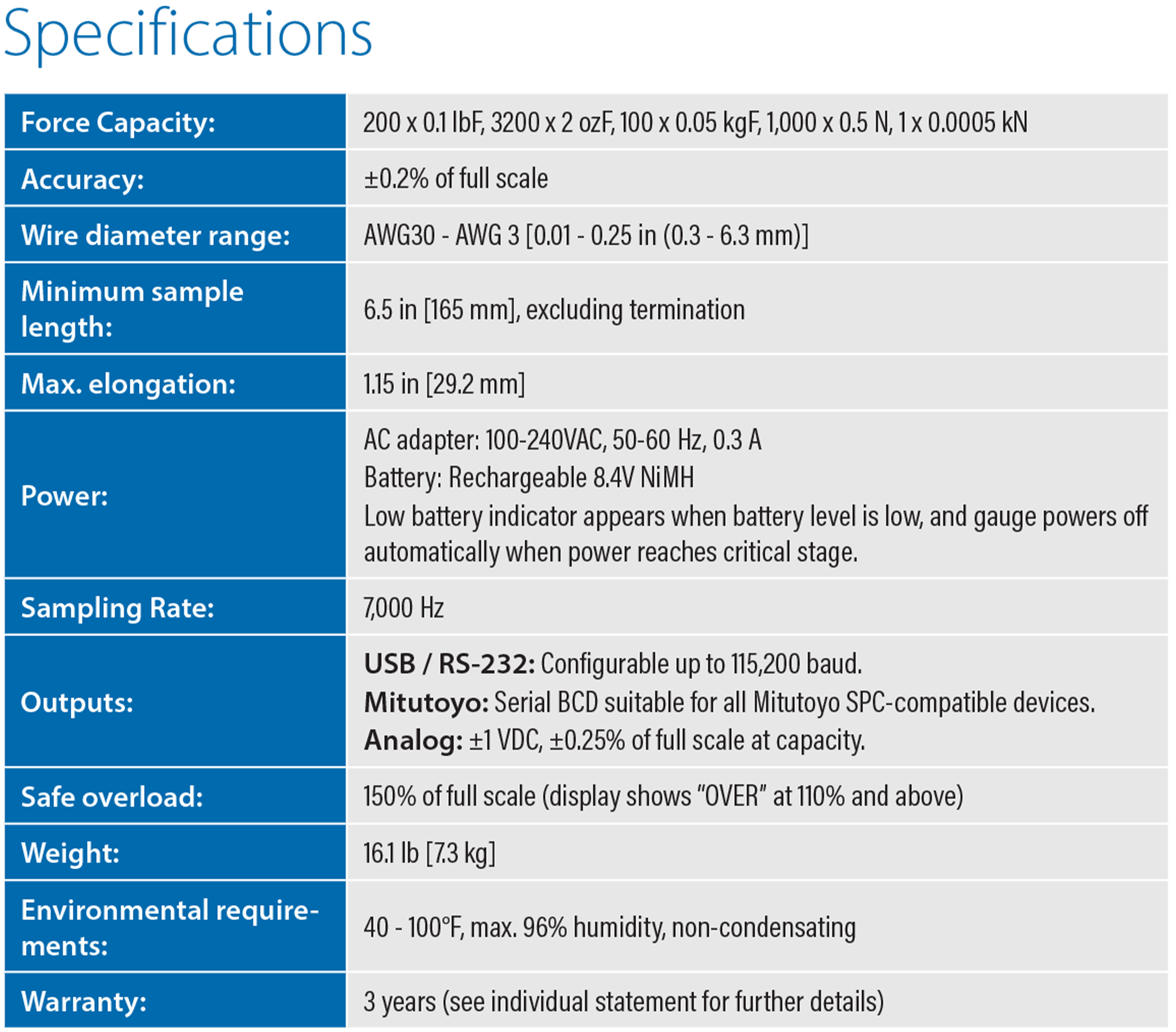 On-board data storage for up to 1,000 readings is included, as are statistical calculations and output to a PC. Unique automatic output / data storage / zeroing upon sample break helps automate testing processes.
