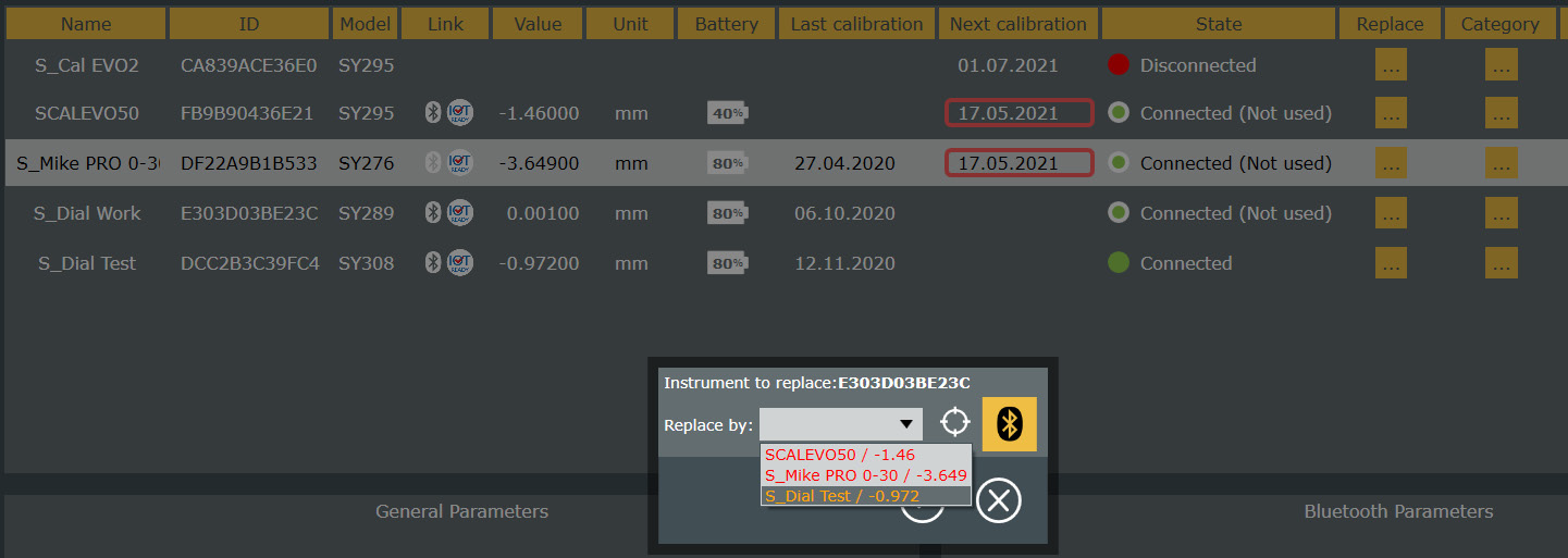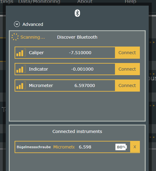 - Bluetooth® connection window displaying the name of the instruments
