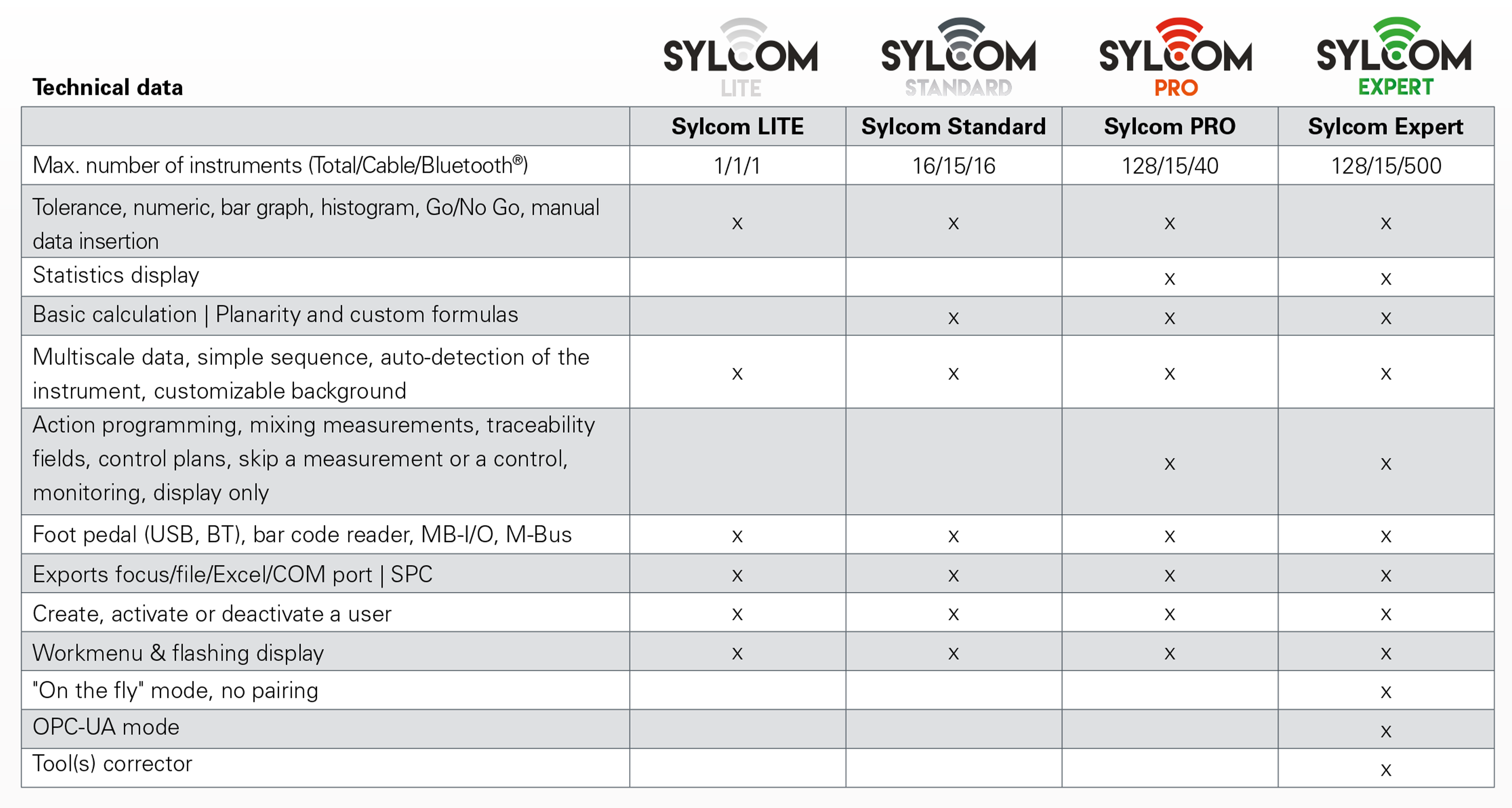 Suited for advanced quality management. Supports: 15 instruments via USB, 40 instruments via Bluetooth, and 128 instruments via M-Bus. Includes features: Control plans, Monitoring dashboards, SPC and Excel data export.