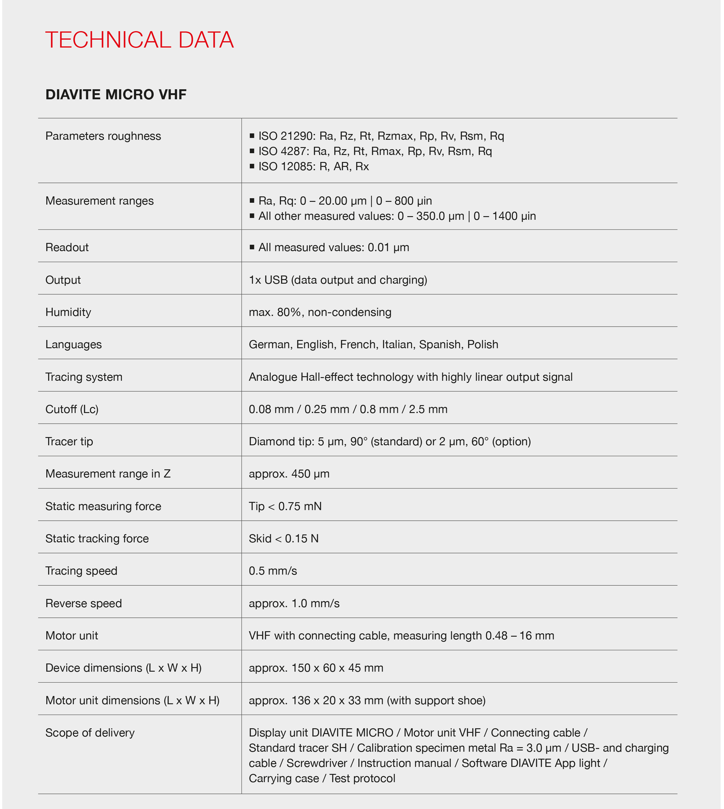 The roughness measuring instruments of DIAVITE AG have been THE STANDARD in surface measurement in many companies for a long time. Each new measurement task is analysed for its feasibility and an individual solution tailored to the customers needs is developed together with the client. This includes, for example, the design of customised tracers, fittings and software adaptations. The measuring systems from DIAVITE AG have already proven themselves in many areas of industry due to their flexible application possibilities, from quality control to testing during series production. Within a few seconds, they deliver exact and repeatable measurements of almost all materials – whether metals, glass, ceramics, semiconductors or polymers.