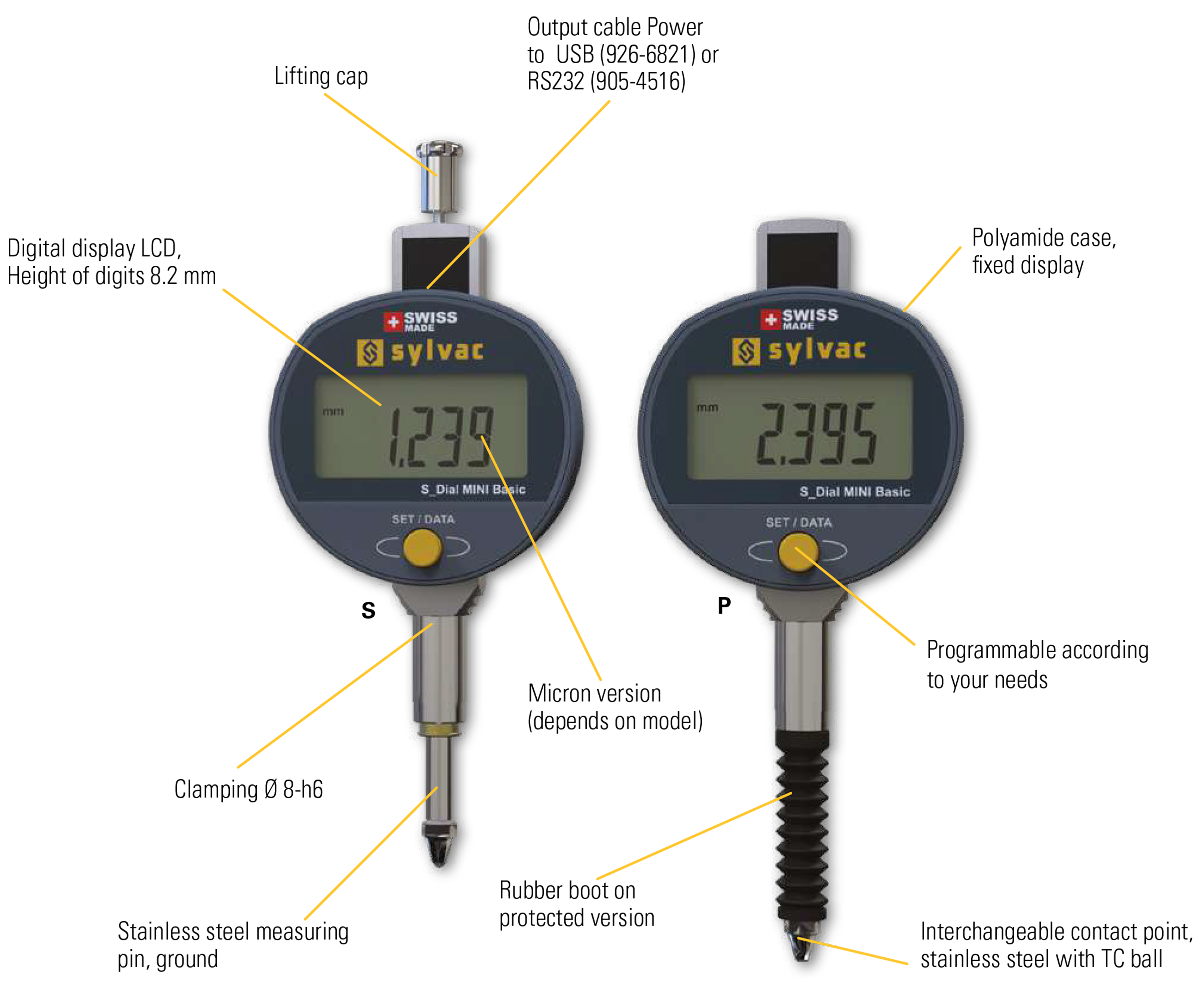 - Robust Executions: Tailor the execution of our digital comparator to meet your exact needs. Choose between the Protected (P) version, featuring IP67 protection with a bellows-protected spindle, or the Standard (S) version with IP54 protection and a lifting cap. Clamping stem Ø 8-h6 of hardened and ground stainless steel.